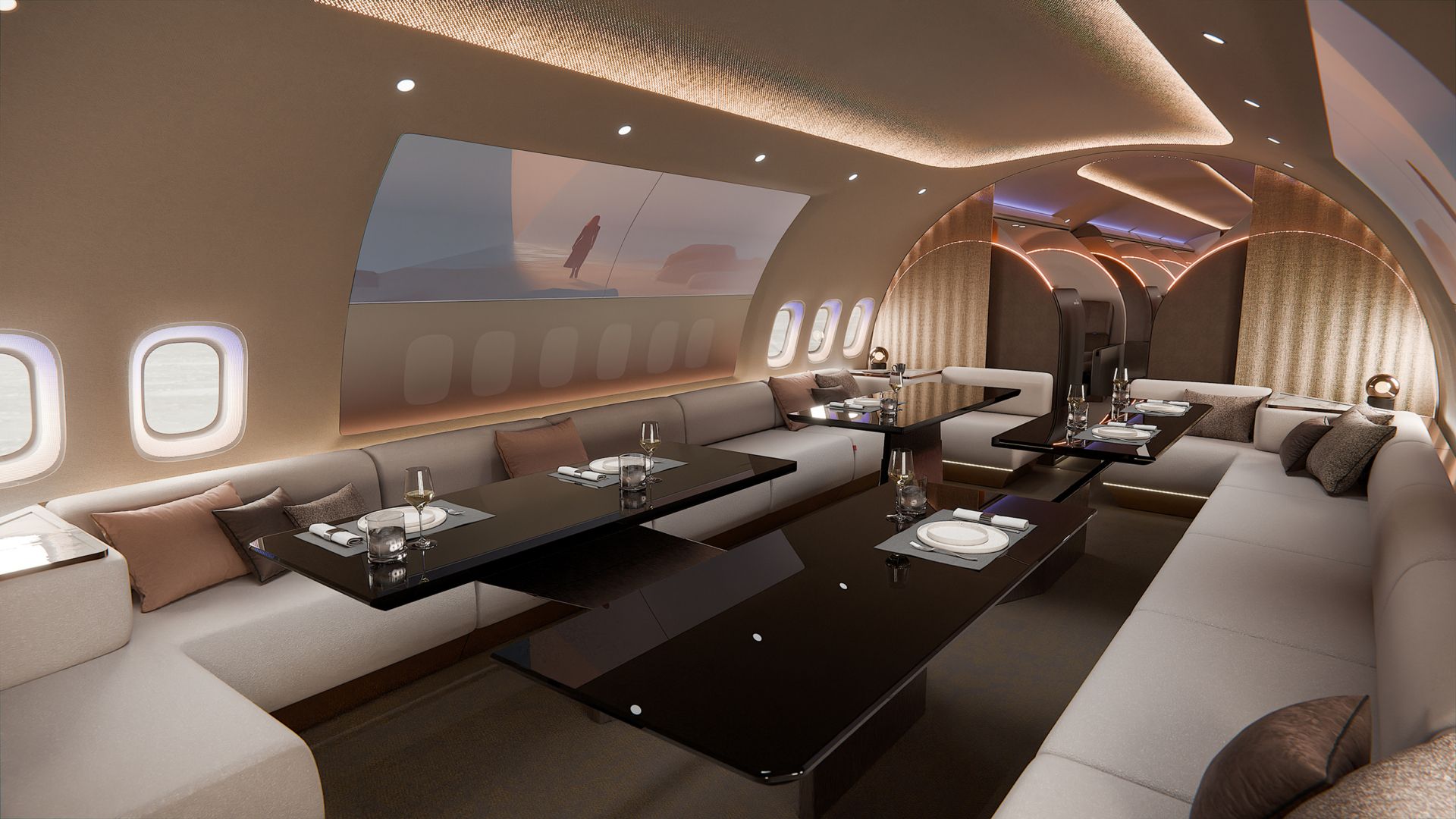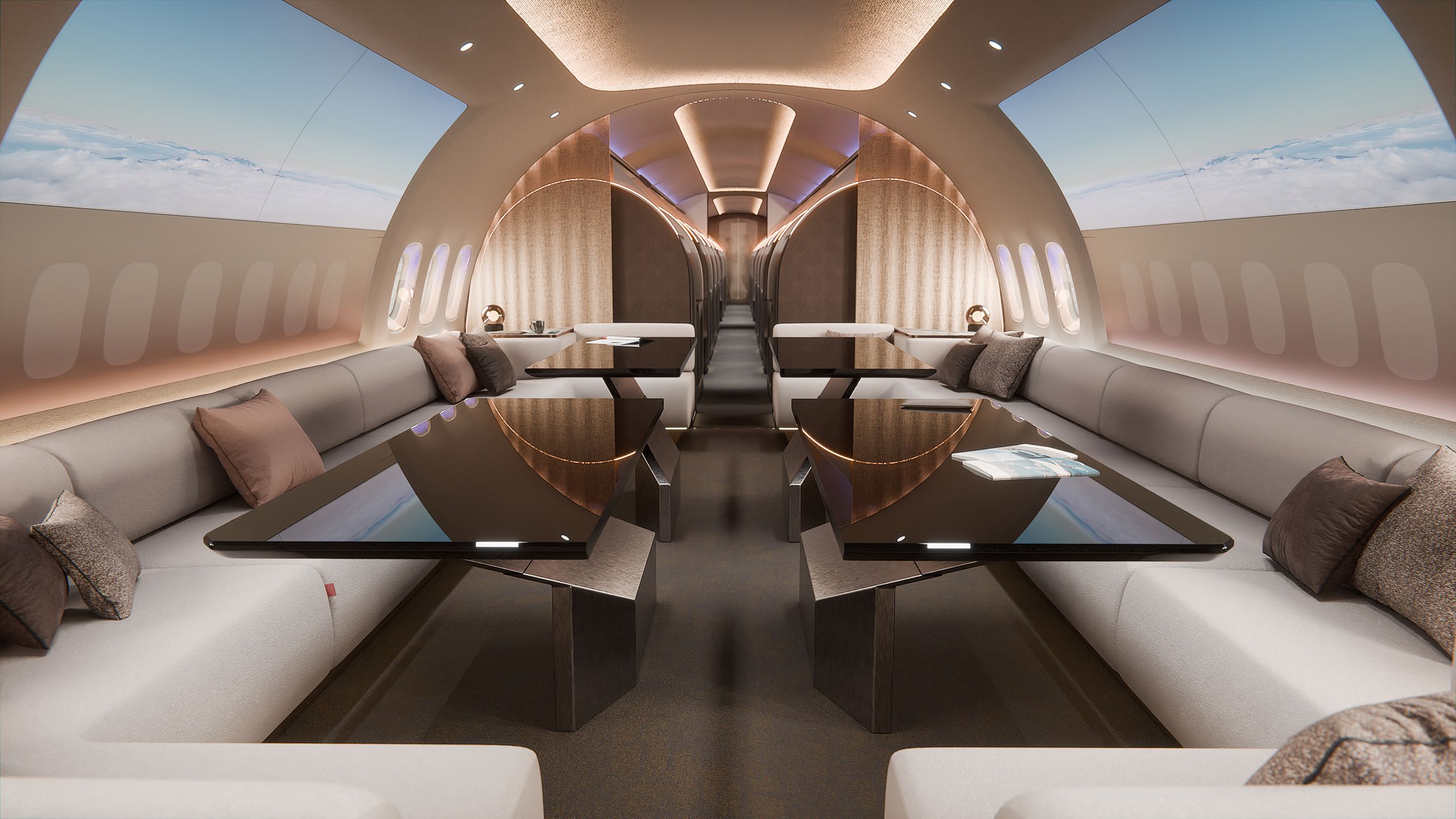 The design target group is not a single VIP passenger, but a group of high-profile users: a corporate board of directors, a professional sports team or a touring band. Each private suite accommodates one or two travelers and can be used for private meetings or shared dining. Every suite includes dedicated personal storage – ideal for items such as a musical instrument, professional equipment, or personal items – while optional movable partitions allow the cabin atmosphere to shift from a cocoon like privacy mode to open social interaction. All suites can be closed individually, and selected compartments feature automated sections that can be raised or lowered to adjust privacy levels. This flexibility allows operators to configure up to 28 passengers on board without compromising exclusivity or comfort.