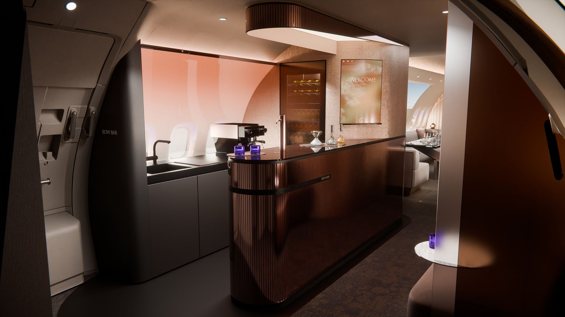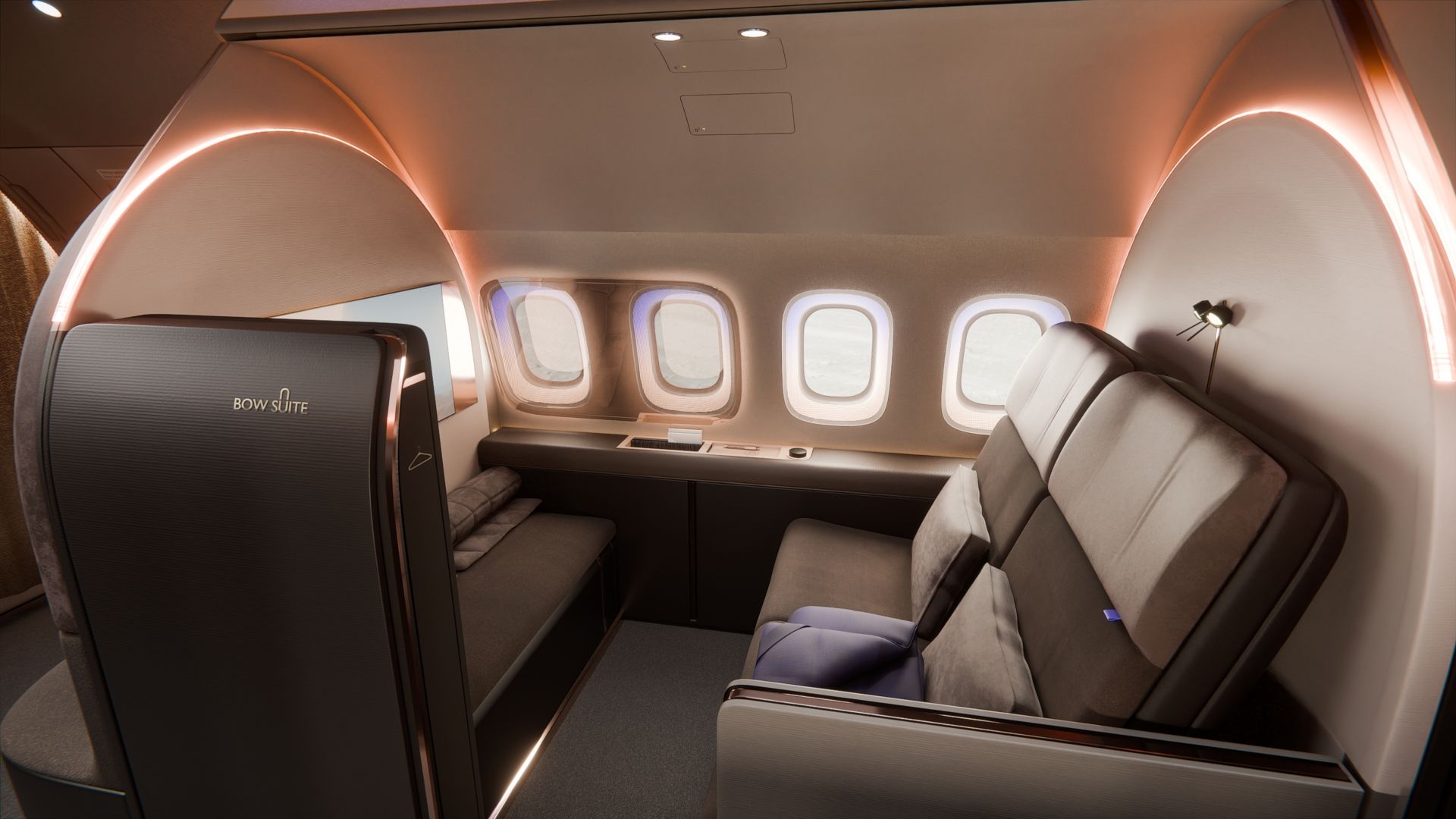 For “The BOW,” both our companies combined their strengths: Designworks, part of the BMW Group for over 40 years (and influential in numerous pioneering design developments, both within the group itself and for leading mobility companies such as Siemens Trains, Virgin Hyperloop, and John Deere) contributed extensive design expertise in the fields of luxury, technology, ergonomics, and experience design. Lufthansa Technik, as the commissioning partner, contributed cutting-edge technologies as well as many years of experience in VIP cabin engineering.